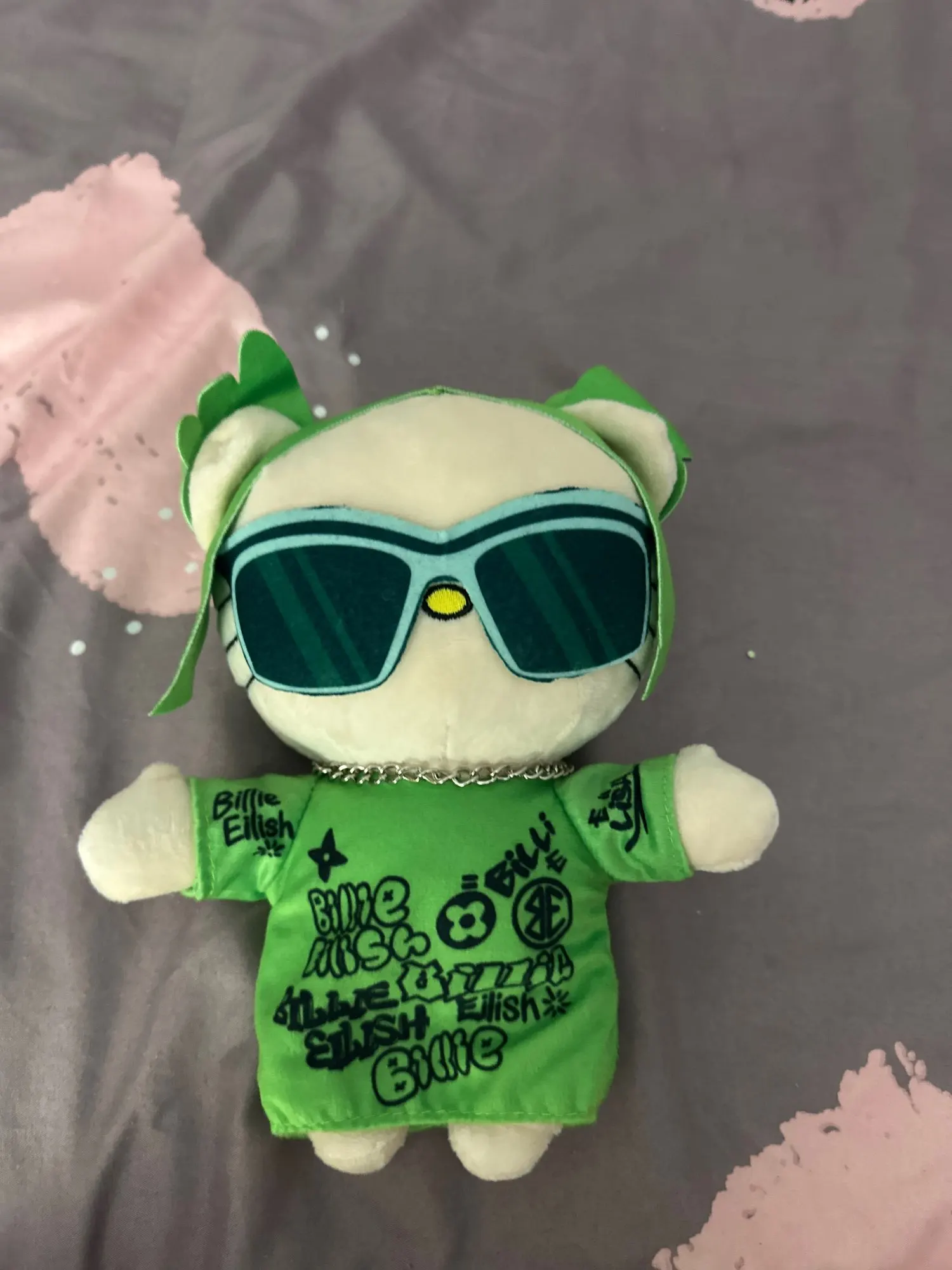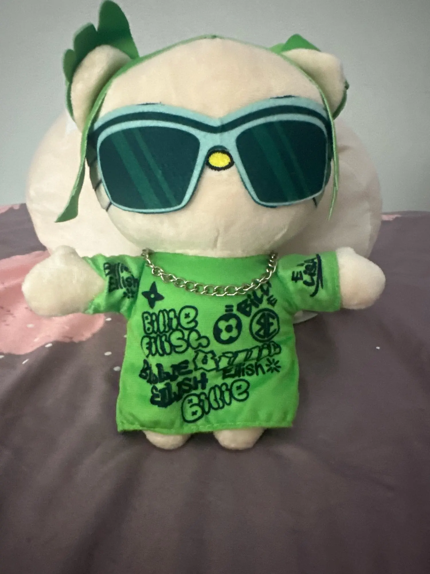 Capture the cool and edgy vibe of your favorite pop icon with the exclusive Billie Eilish Hello Kitty plush. This neon green Billie Eilish doll perfectly encapsulates the signature style that defined a generation of music fans. Whether you are a hardcore fan or a collector of Billie Eilish music memorabilia, this Billie Eilish stuffed toy is the perfect addition to your shelf.